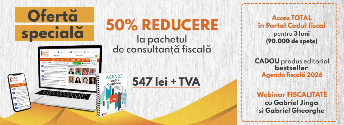 In calitate de abonat la www.PortalCodulfiscal.ro, beneficiati GRATUIT de consultanta telefonica, in fiecare miercuri, timp de 2 ore, in intervalul 15:00 - 17:00! In acest interval, specialisti de calibru asteapta telefonul dvs., gata sa va ofere un raspuns impecabil pentru intrebarea dvs., un raspuns perfect argumentat, cu temeiuri legale si comentarii bazate pe o solida experienta practica.